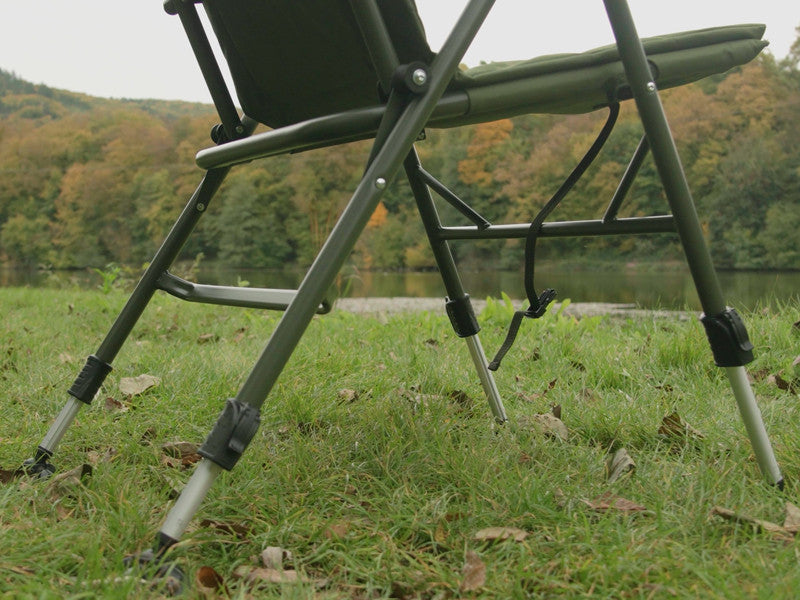 Die höhenverstellbaren Beine ermöglichen die Anpassung des Stuhls an unebenes Gelände und gewährleisten Stabilität auch unter schwierigen Bedingungen. Für einen sicheren Stand sorgen die flexiblen, robusten Füße, deren große Fläche ein Einsinken der Beine in weichen Boden am Wasser wirksam verhindert. Zusätzlich ist der Stuhl mit einem Kunststoffclip ausgestattet, der seine Position während des Transports fixiert und ein ungewolltes Aufklappen verhindert.