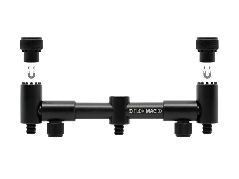 Die Arme sind von unten flach geschnitten, so dass sie beim Anziehen der Feststellschrauben perfekt an ihrem Platz bleiben und sich nicht verdrehen. Der FlexiMAG BUZZ ist aus dem massiven Aluminium gefertigt und mit einer haltbaren schwarzen Pulverbeschichtung versehen. Er ist in zwei Größen erhältlich, nämlich in der kürzeren L-Version für zwei Ruten und in der längeren XL-Version für drei Ruten.