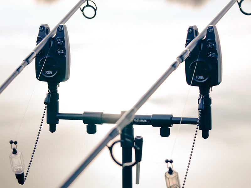 Ruten-Buzz Bar mit den magnetischen Schnellverschlüssen und Universalgewinde, kompatibel mit den meisten auf dem Markt erhältlichen Rutenhaltern und Sturmstangen. Der Vorteil des Schnellverschlusses besteht darin, dass Sie die Bissanzeiger- und Rückhalterungen im Gewinde eingeschraubt lassen können und sie bei Bedarf einfach aus dem Buzz Bar herausziehen bzw. bei Angelbeginn wieder einklicken können. Die einzelnen Arme sind ausziehbar, so dass Sie die Breite der Buzz Bar an Ihre Bedürfnisse anpassen können, z. B. an die Größe Ihrer Rollen. Beliebt ist auch, vordere Buzz Bar zu strecken und eine fächerförmige Verteilung der Ruten zu schaffen, wobei die Spitzen leicht auseinander stehen.